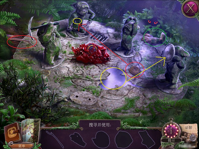 3、7用钥匙开红笔记本打开,在日记中可以找到女孩的生日,那就是开骷髅脚上的密码,翻到最后得到一张CD,8放大装有头发的纸,点打火机,再点纸,可以烧出东西来,放大药瓶,里面有两粒药,一张写有箴言的纸 放大绿十字,按照箴言的顺序位置和烧出来得数字相对应形位相同,把字6张图片填在。