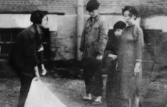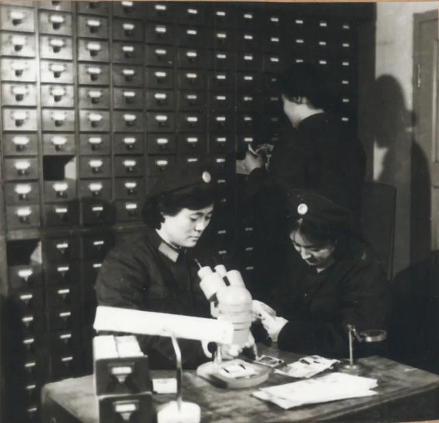1948年10月,大连黑咀子检查站女检察员王玉梅(左一)执勤时,从伪装的国民党特务行李中查获秘密文件及鞋跟微型发报机。
