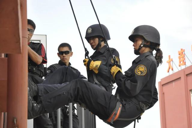 ▲女特警在演练高空索降。