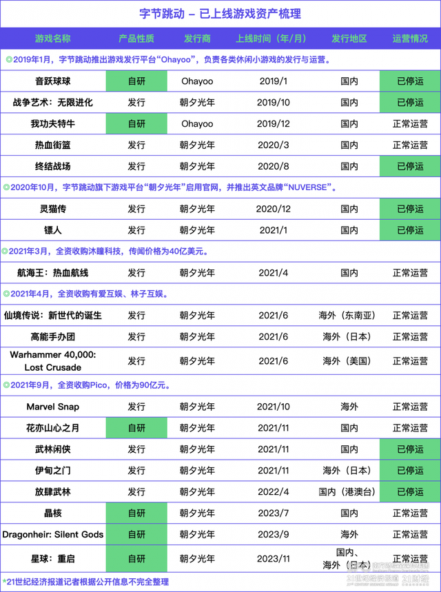 (字节跳动旗下游戏资产梳理。21世纪经济报道记者根据公开信息不完全整理)