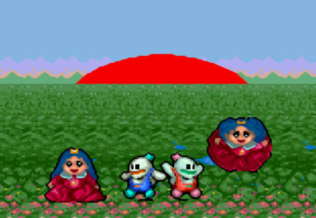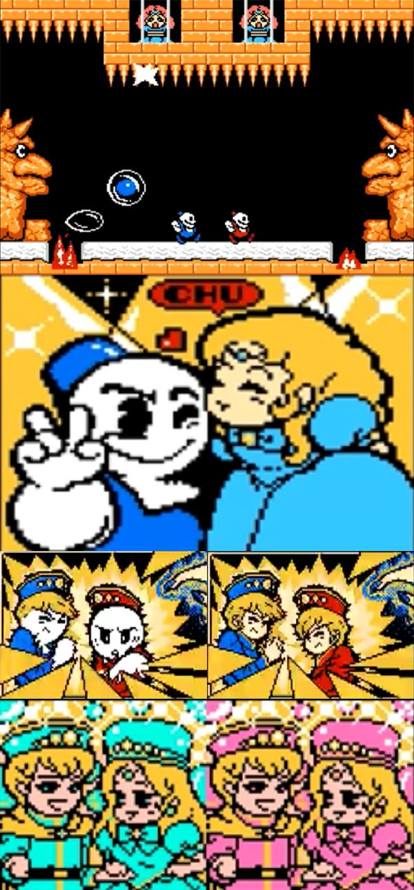直到我们玩了FC版之后才知道。原来两位主角是小王子,被人施咒变成了雪人,在通关之后咒语破除终于变回了原来的样子,并且一人娶了一位公主。