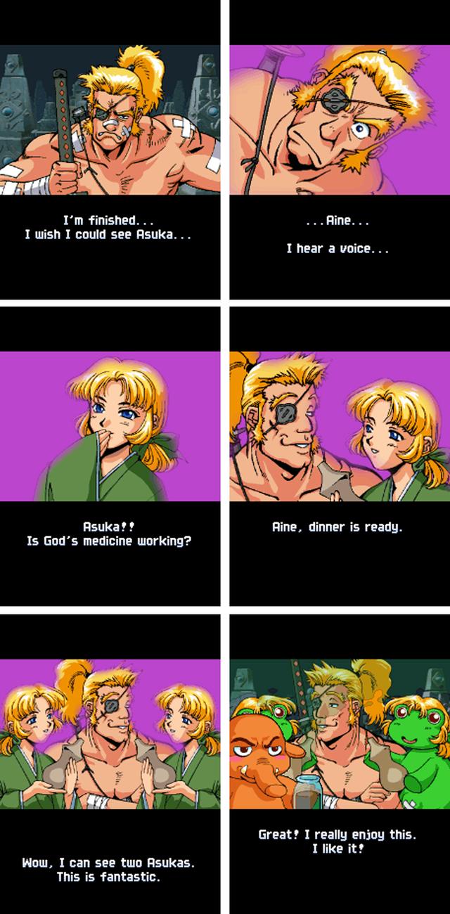 《武装飞鸟2》中的结局有很多种,而阿伊遇到的则全都是比较搞笑的剧情。战斗结束之后,他许愿快点见到明日香。