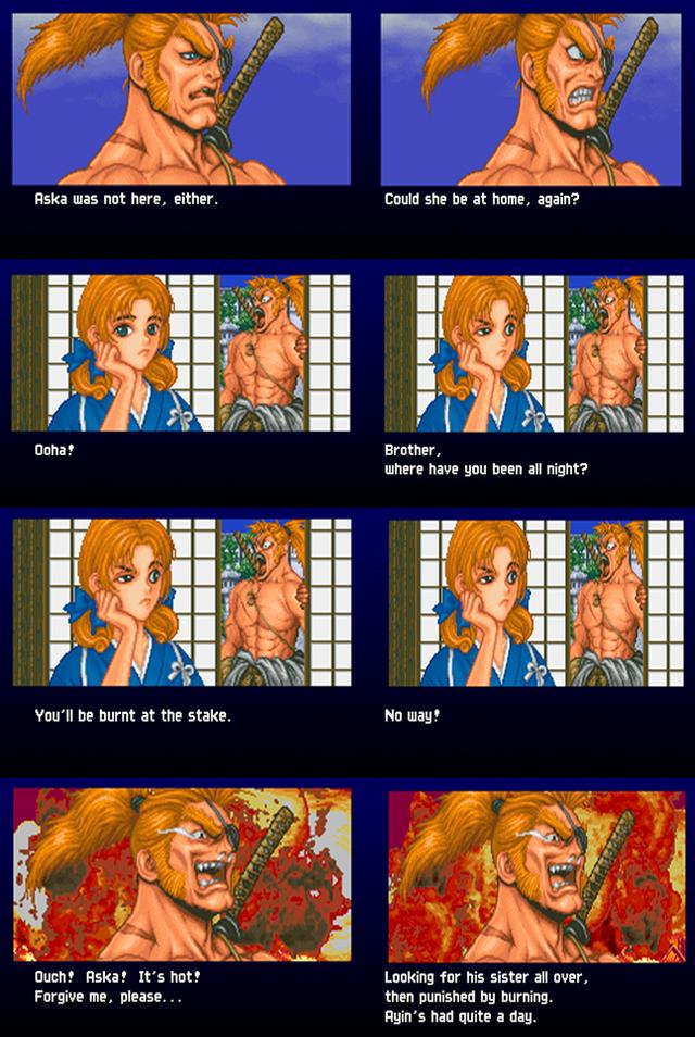 到了《战国之刃》时期,阿伊的命运依然是相当“悲催”的。和天外组队会成为基友、和尤妮丝组队会被忍猿烧、和翔丸会“牺牲”、和小夜会被暗算。如果是一个人通关的话,则满世界的寻找表妹明日香,但最后也没找到,悻悻回家时才发现表妹就在家里。为了惩罚阿伊到处乱跑,表妹对他施火魔法,把阿伊烧得半死。