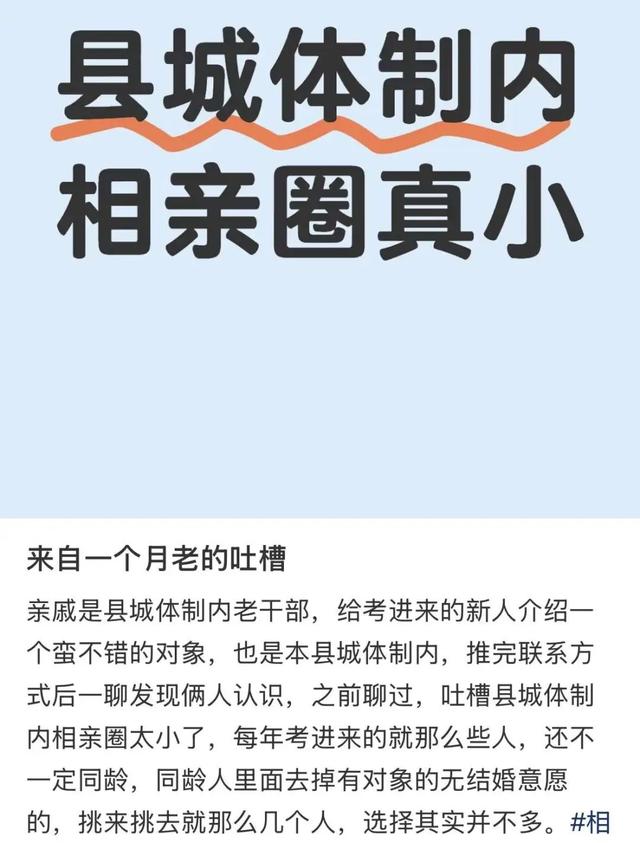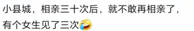 在很多讨论县城相亲的帖子下,有人惊叹于自己半年前聊掰了的相亲对象,半年后已经成了单位同事的老公;