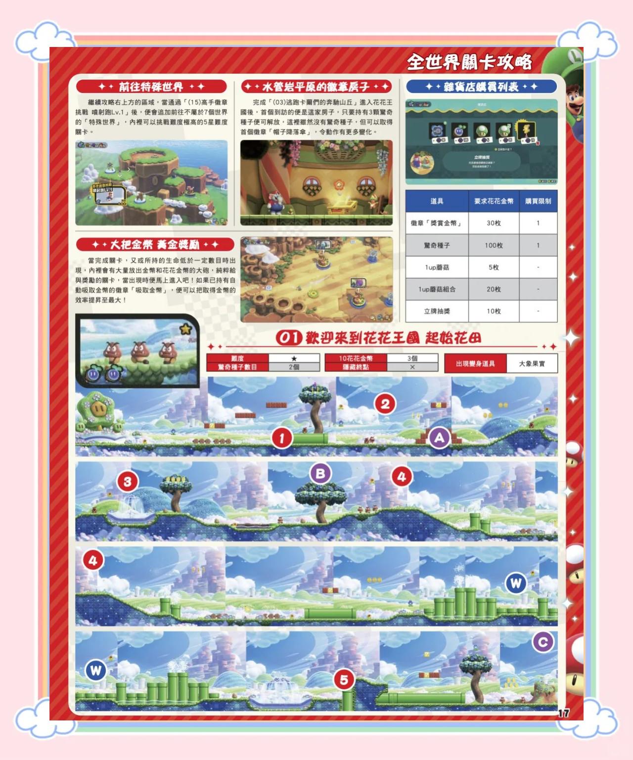 每一大关第1小关有绿蘑菇,从21开始的绿蘑菇,只有跳关或者在前一大关的3小关吃掉全部金币才可以顶出来唯一例外是在13关可以漏掉2个金币大马里奥和子弹马里奥都可以抵挡敌人的一次攻击,抵挡以后变回小马里奥关卡包含多种背景环境,如草地地下天空城堡树林海洋长桥和雪地等,每个。