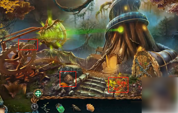 桌子上有砝码,车轱辘旁边有捕网,床下有油壶地毯掀开,有红色图章进去拉着帘子的房子,完成场景解密,得到龙首回去绿水晶那里,把龙首放在门上,点击让两个龙头向下,开门,进去找到第三个砝码去桥那里把三个砝码放在右边,桥就修好了,继续前进看到大船,树上有蘑菇和树脂,用匕首割下来。