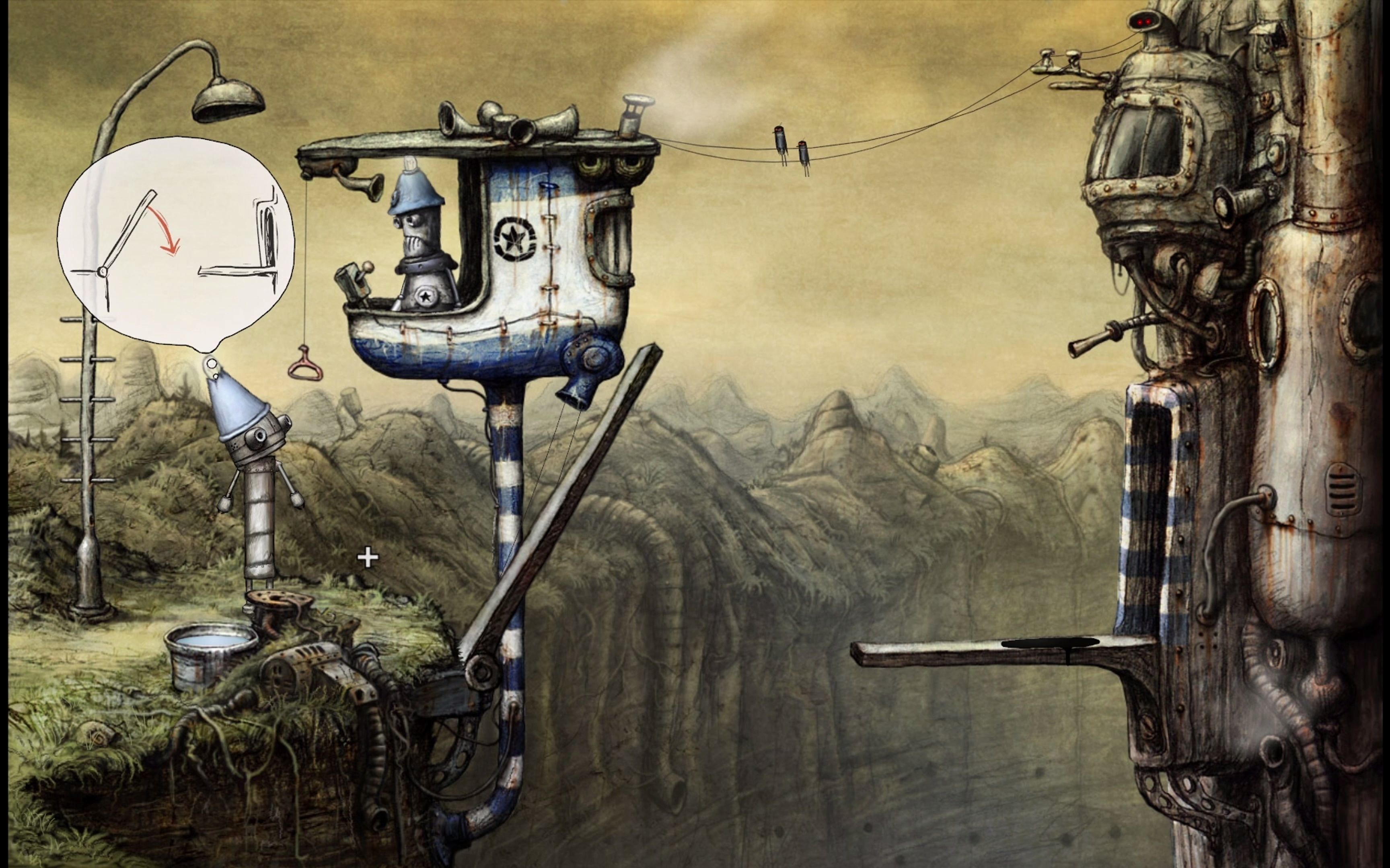 机械迷城怎么玩 第一章 先组合机器人游戏刚开始,会显示这个界面,不会操作者可以参见机械迷城怎么玩一文然后就是组装机器人,点击图中白圈内位置,身子掉下来了再点击机器人的头部,身子也出来了可是他还是没有手和脚,咱可怜的主人公点击旁边的小老鼠,它会像你要一个娃娃将机器人拉高。
