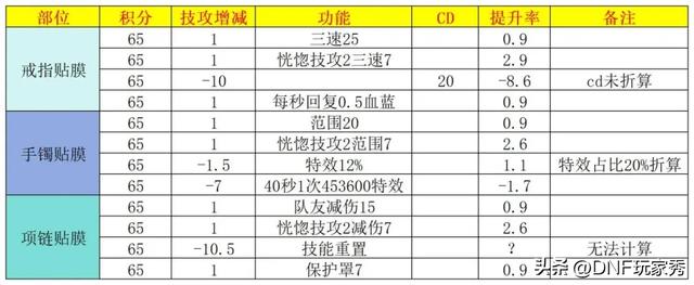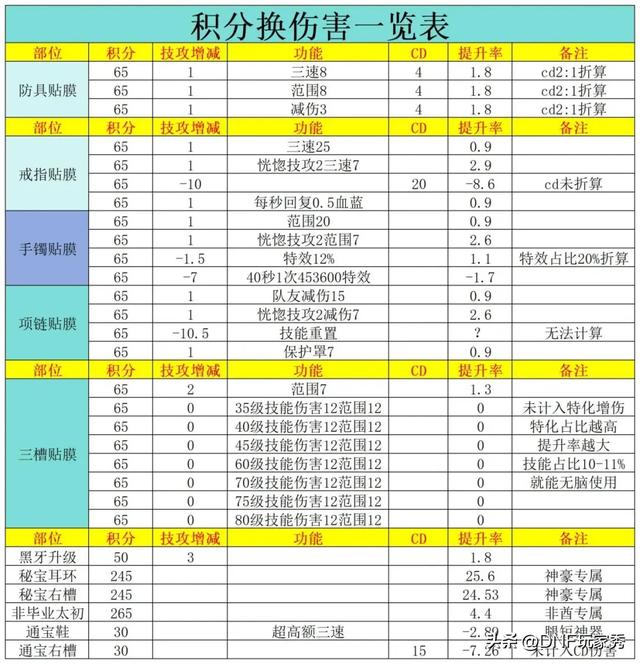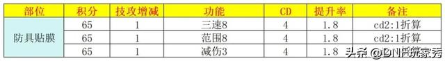 【防具贴膜】65积分换“1%技攻、4%CD、三速/减伤/范围、100名望”,如果CD折算2%技攻,提升率大约1.8%。