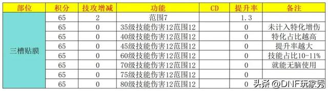 【三槽贴膜】65积分换“特化35/40/45/60/70/75/80伤害+12%、范围+12%、名望100”,提升率根据技能占比而定,占比越高提升率越大,不能计算。
