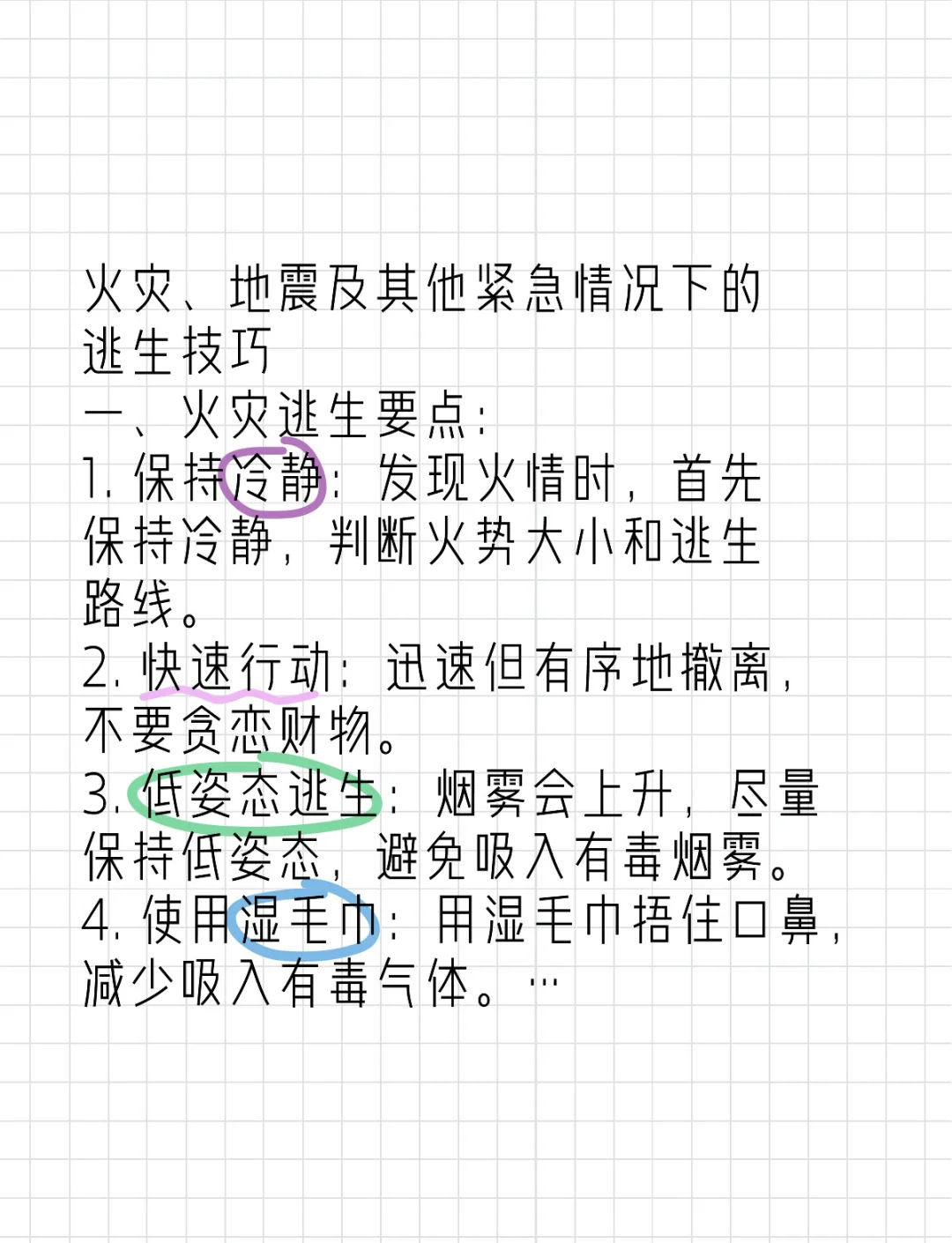 利用逃生通道使用楼梯消防电梯等逃生通道,避免使用普通电梯携带重要物品在确保安全的情况下,携带身份证手机钥匙等重要物品二地震逃生攻略 保持冷静迅速判断地震烈度和逃生路线躲避危险区域远离窗户外墙吊灯等可能掉落的物品躲在坚固家具下如桌子床下等,保护头部避免使用电。