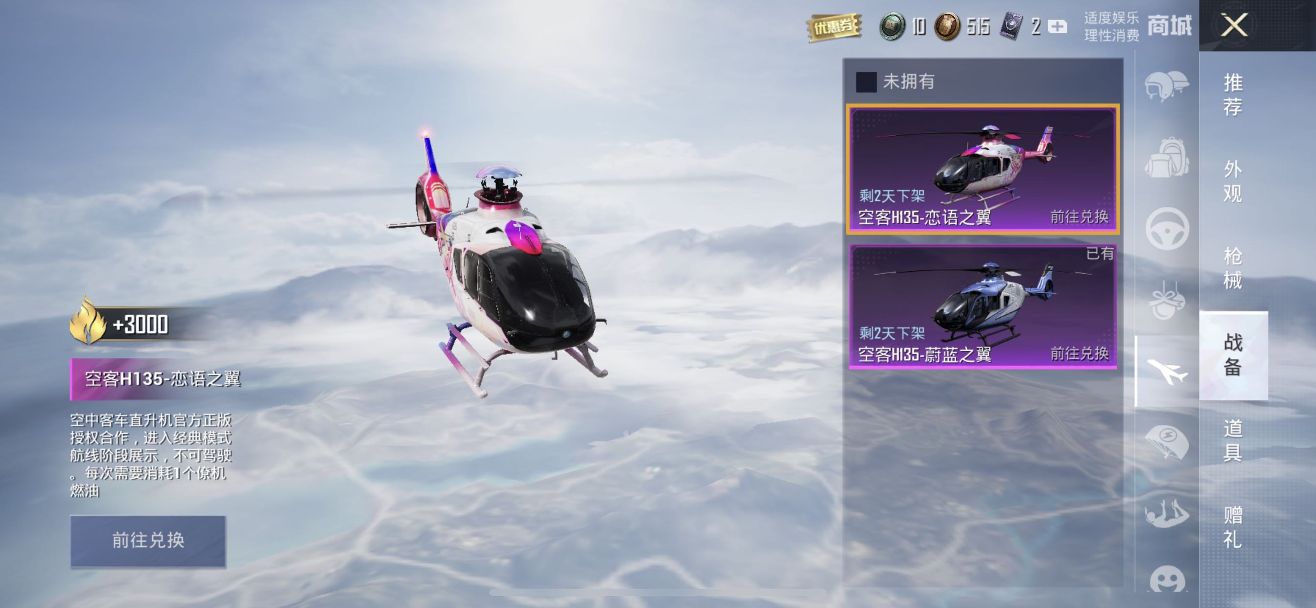 和平精英僚机皮肤目前主要通过新军需系统获取,且无法使用往期扭蛋碎片兑换具体途径如下根据游戏爆料及分析,僚机皮肤如空客H135与载具皮肤阿斯顿马丁类似,无法通过往期军需的扭蛋碎片或勋章兑换此前五圣伏魔活动期间,官方已限制载具皮肤使用碎片兑换,僚机皮肤作为同期或后续推出的高价值道具,延续了这。